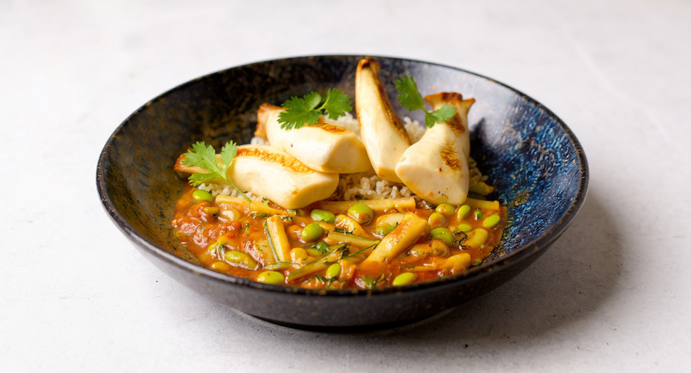 Aromatische Kräuterseitlinge mit kräftigem Umami treffen auf einen frischen, süß-sauren Gurken-Edamamesalat. Dazu lockerer Reis und duftender Koriander – ein veganes Asia-Gericht, das voller Geschmackstiefe steckt und ganz ohne Fleisch begeistert.